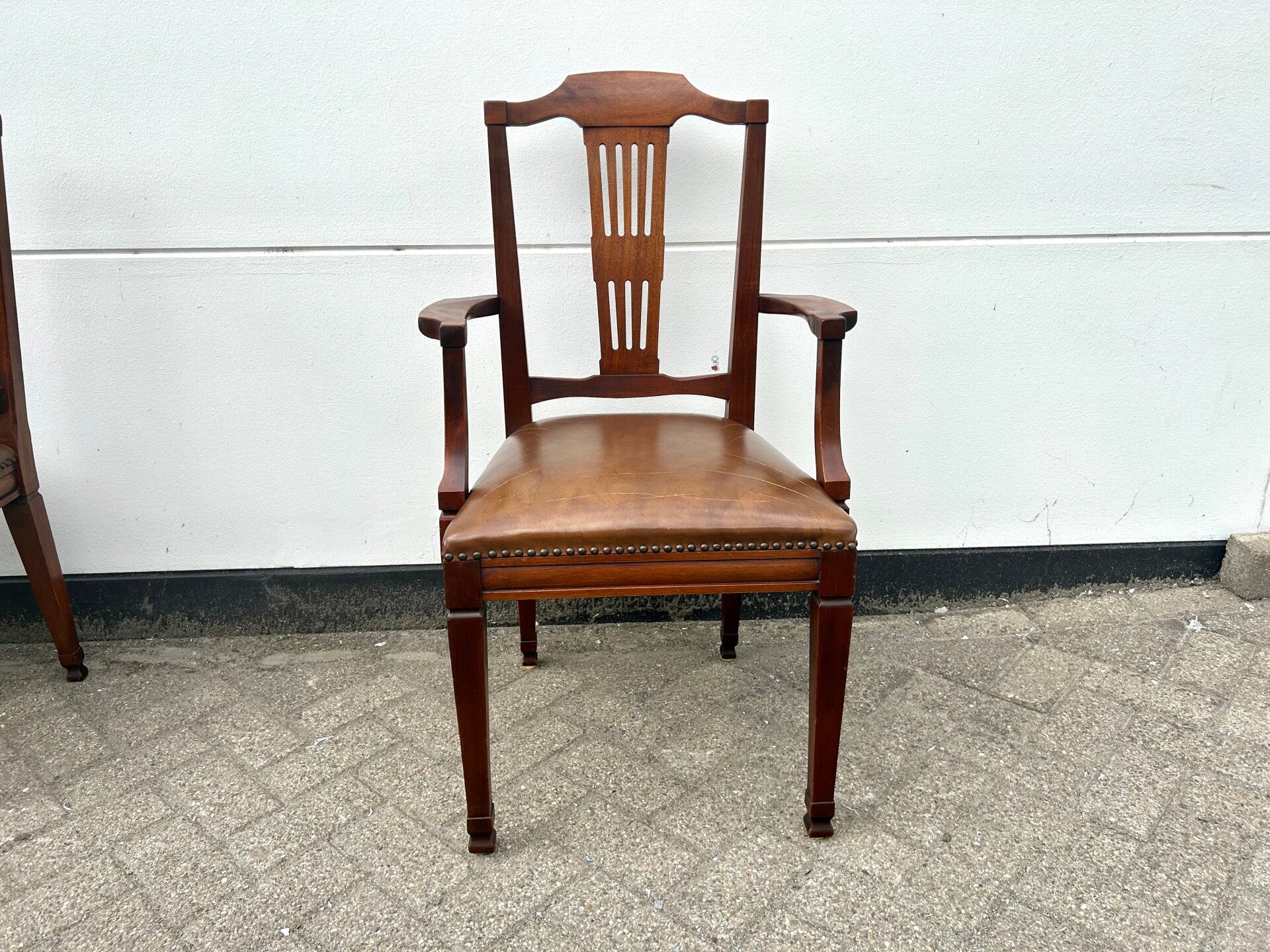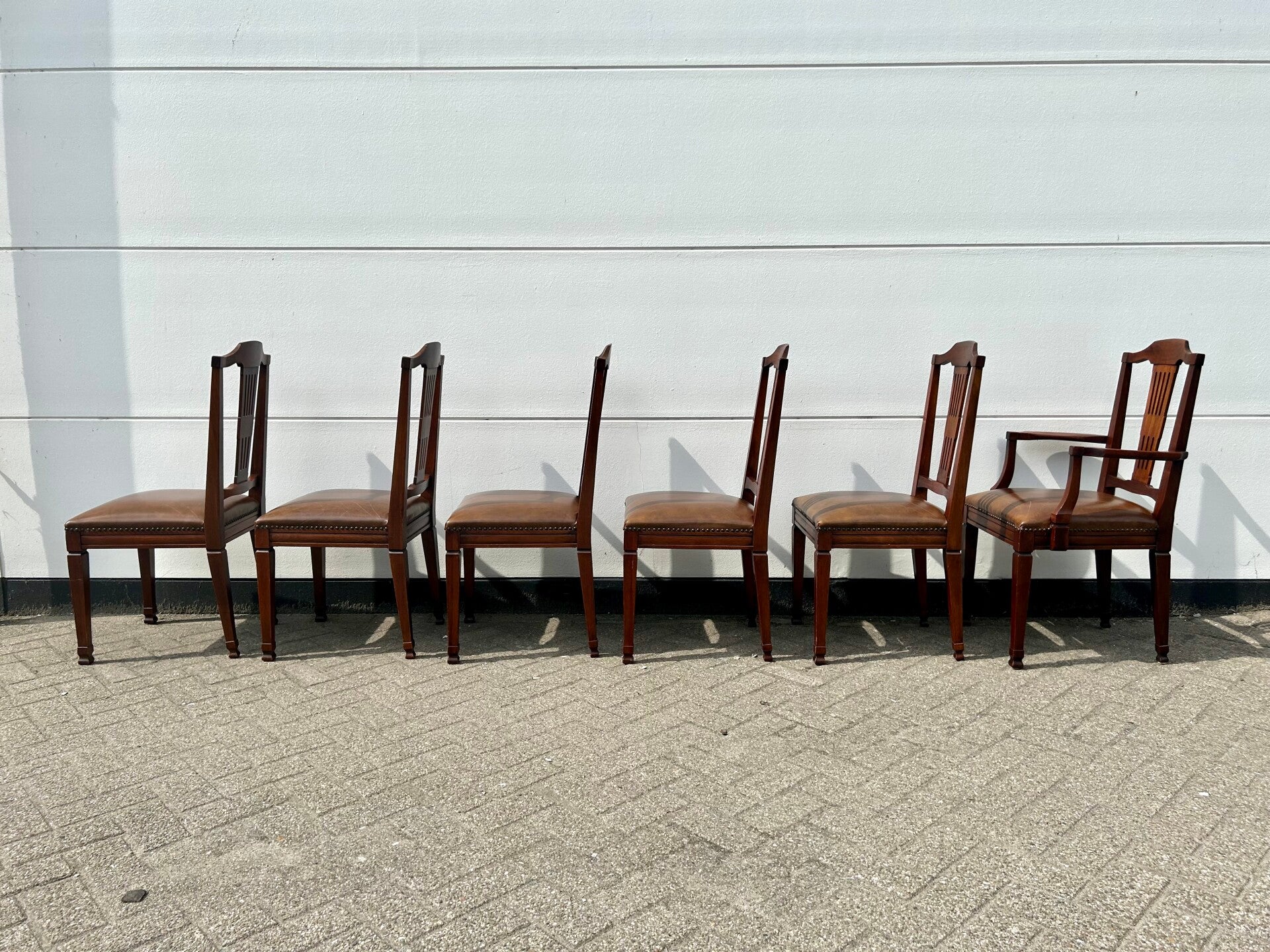 Set van zes Mahoniehouten Eetkamerstoelen Met bruin leer bekleed