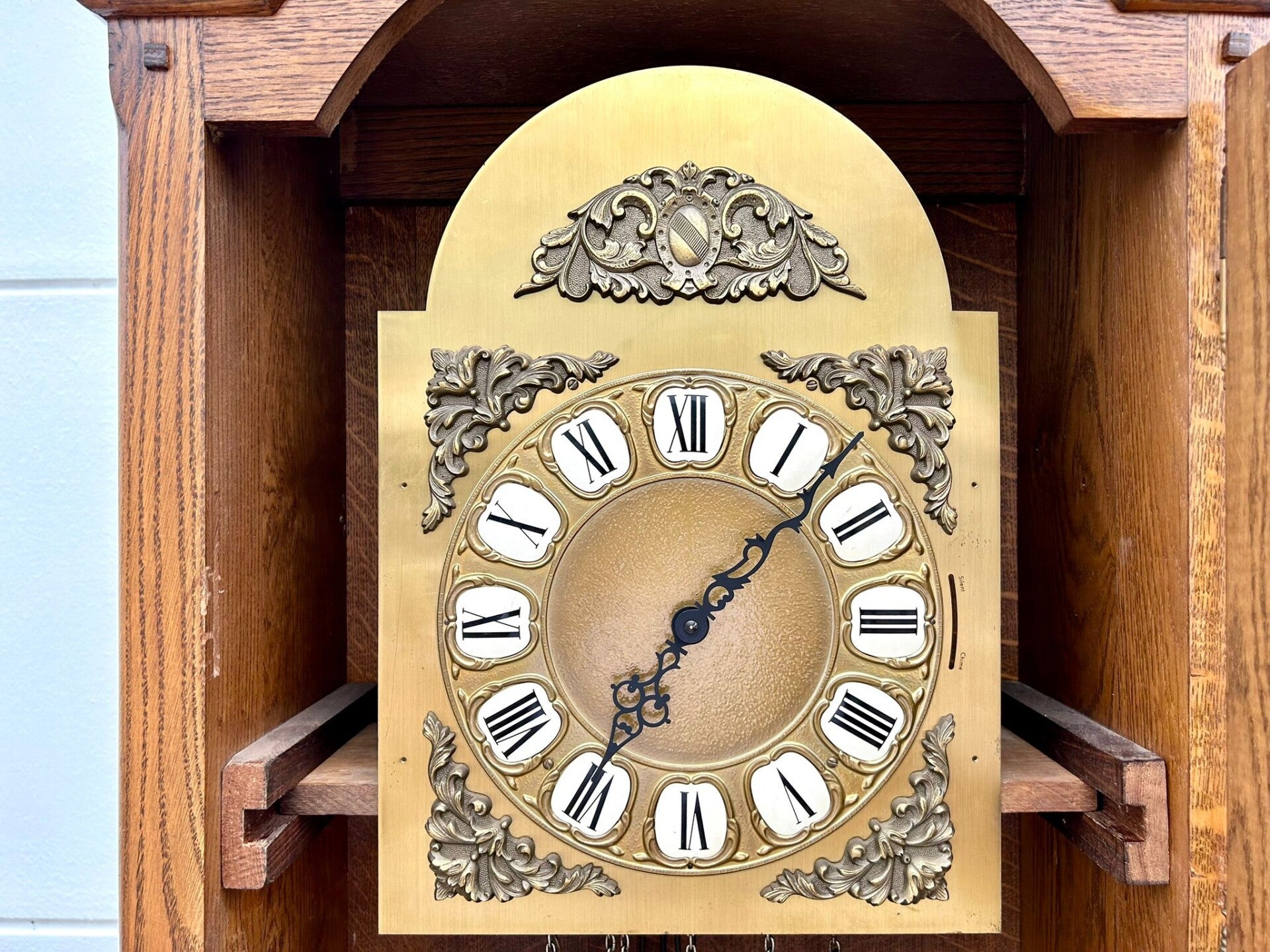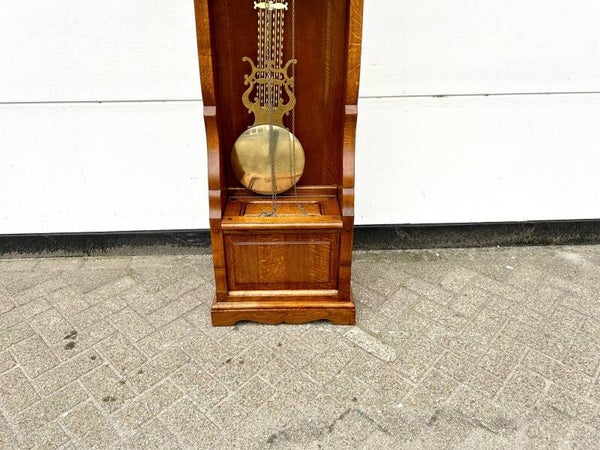 20e eeuw | Mechanisch, Een-daags uurwerk met slag + melodie op het kwartier | Gong staven | De slag kan ook uitgeschakeld worden door middel van een schuif achter de Bronzen wijzerplaat met Romeinse cijfers | Hoogte 208 cm | Breedte 59 cm | Diepte 27 cm | Vrijblijvend bezichtigen is dagelijks mogelijk in Harderwijk | Bezorgen is in overleg mogelijk