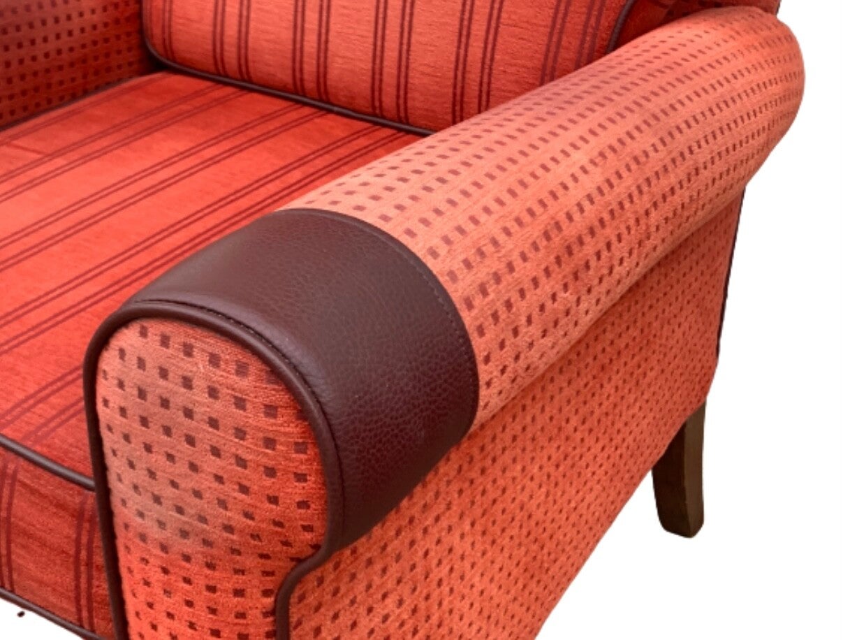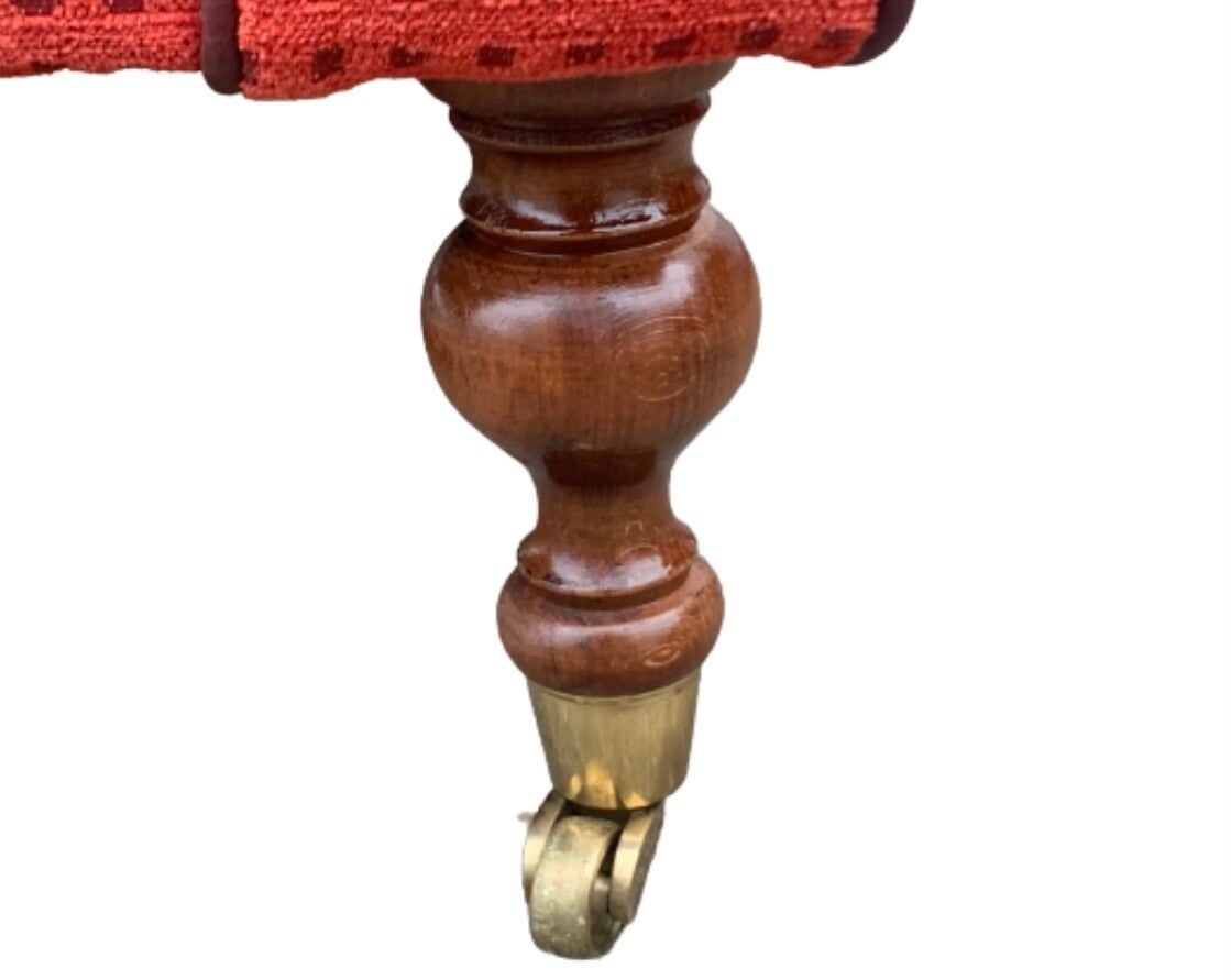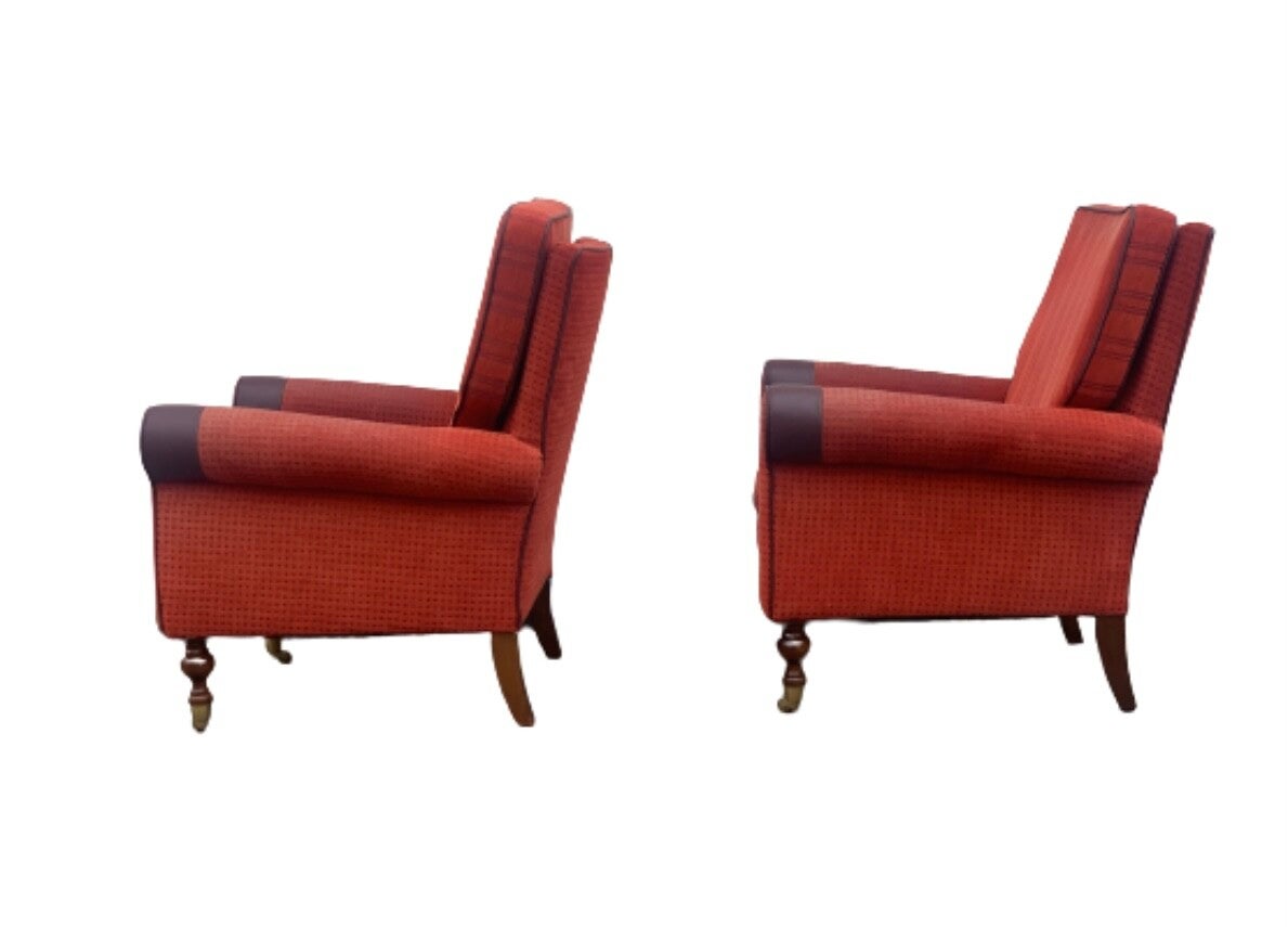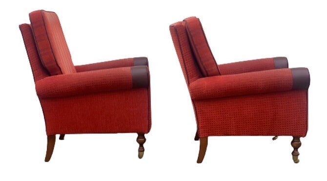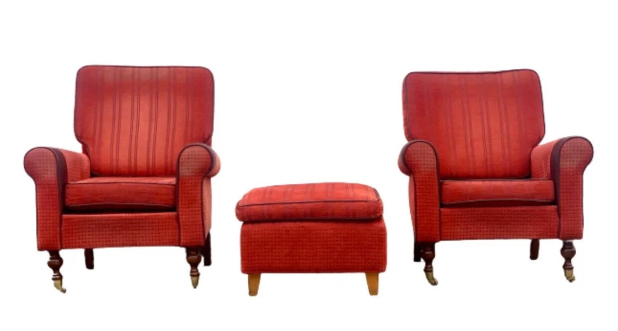 Stel Klassieke Rood Gestoffeerde Engelse Fauteuils + Hocker