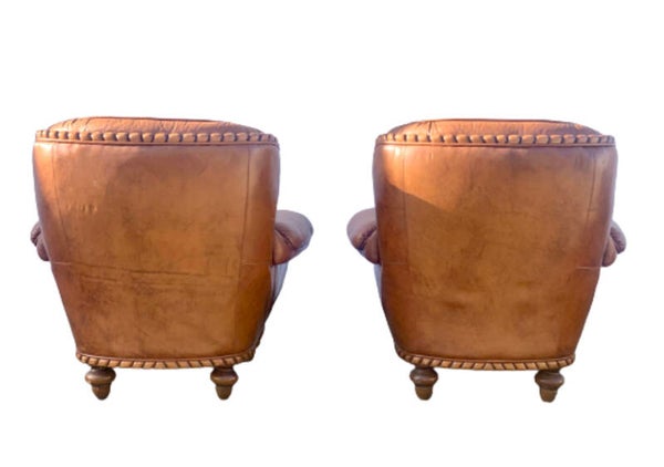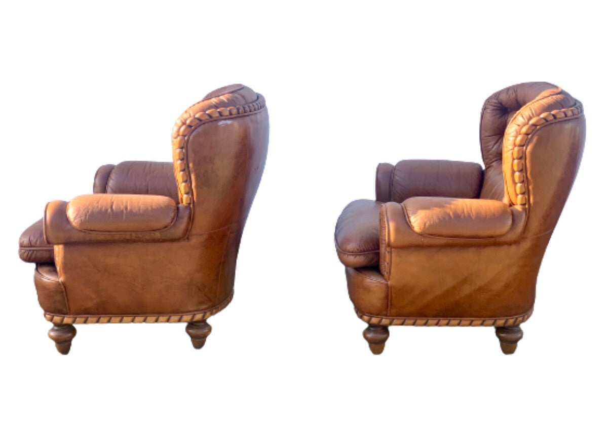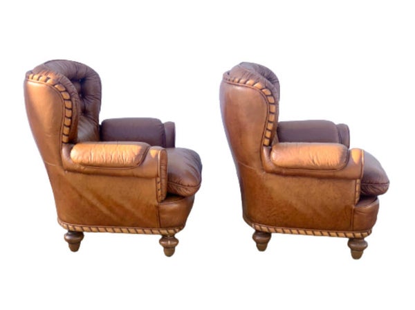 - Twee identieke bruine leren fauteuils